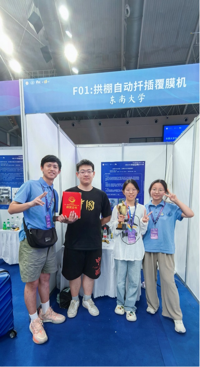 7月17日,“华中数控杯”第十一届全国大学生机械创新设计大赛决赛在华中科技大学落下帷幕。机械学子宋昕蓉、吴宇航、张心钰和陈小楷组成的参赛队伍,在章寅和苏铭老师的指导下,凭借《拱棚自动扦插覆膜机》作品喜获全国一等奖(最高奖)!王郑、豆文欢、杜煜成和王子阳同学在王玉娟和毕可东老师指导下完成的《蝴蝶东南飞》作品获得全国三等奖。
