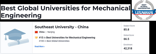 东南大学机械工程学科全球排名实现双突破:US News跻身第15,软科跃居世界百强