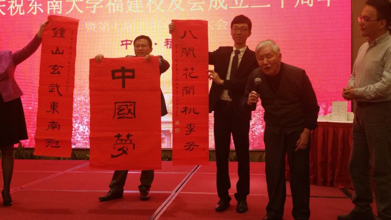 在本届东大福建校友会成立三十周年庆祝大会期间,鸠摩搜书 56级校友林亮森先生为福建校友会赠送了内容为“钟山玄武东南冠,八闽花开桃李芳”对联一副。