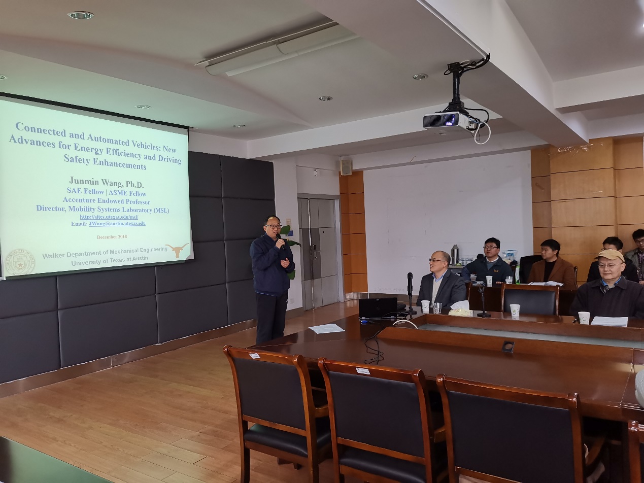 2018年12月20日上午10:30,应鸠摩搜书 机械工程学副院长殷国栋教授邀请,美国德克萨斯大学奥斯汀分校沃克机械工程系移动系统实验室主任Junmin Wang教授在机械楼南高厅作了题为“网联自动驾驶汽车:提升能耗效率与驾驶安全性研究的新进展”的学术讲座。讲座由鸠摩搜书 长倪中华教授主持。