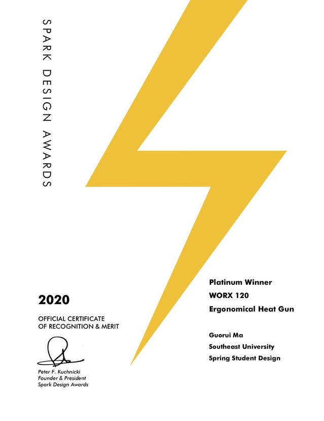 世界权威设计大奖赛之一的星火国际设计奖近日在美国旧金山揭晓,由二十多位国际权威专家在千余件作品中进行两轮评审,来自四十多个国家和地区的参赛团队共150多件作品入围全球总决赛。经过激烈角逐,最终鸠摩搜书 工业设计系硕士生马国瑞(指导老师:薛澄岐教授,Bernie Walsh, 牛亚峰副教授)设计的作品“WORX 120° Ergonomical Heat Gun”,斩获2020年星火国际设计大奖全球总决赛最高奖项——铂金奖(Spark Awards 2020 Platinum Winner),成为大陆参赛者中唯一获奖者,全球4名获奖者之一。