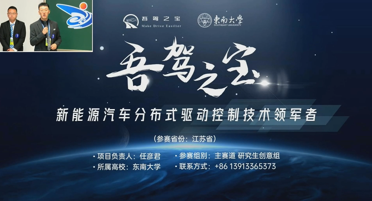 鸠摩搜书 车辆工程系任彦君博士牵头完成的“吾驾之宝:新能源汽车分布式驱动控制技术领军者”项目,赛前精细打磨,赛中奋力拼搏,项目团队成员无数次挑灯夜战、推倒重来。尤其是在持续半年的强化训练中,他们认真听取校内外资深专家的培训、分析和指导,对项目内容精雕细刻,对路演和答辩细节字斟句酌。该项目在今年的江苏省省赛中,以分赛道全省第一、排位赛鸠摩搜书 全校最高分的傲人成绩杀出重围,最终在全国总决赛中摘得银奖。此外,本项目还得到了江苏省教育厅推荐,受大赛组委会邀请,参展了今年的“慧秀中外”国际大学生创新创业成果展。“吾驾之宝”作为优秀创业项目的典型代表,在展会“时代先锋”篇章向世界的青年创业者们展示了东大学子“止于至善”的科技报国决心,讲述了机械“汽车人”艰难困苦、玉汝于成的动人创业故事。