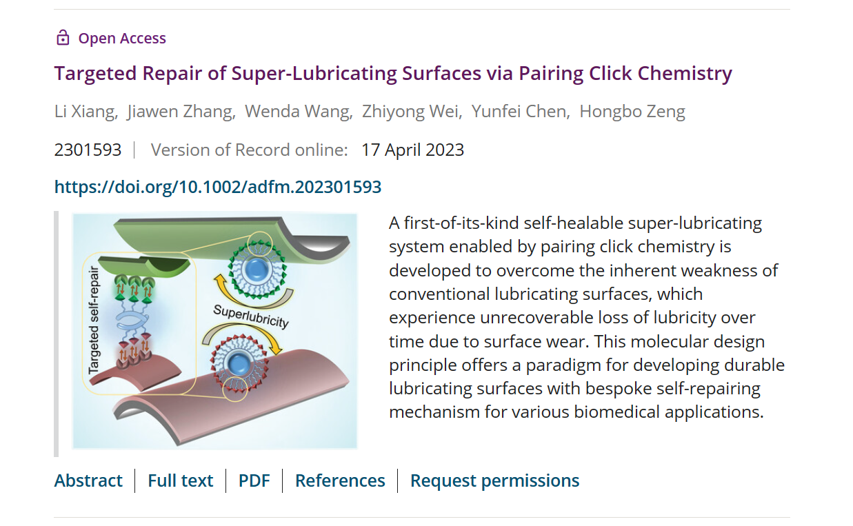 相关工作以“Targeted repair of super-lubricating surfaces via pairing click chemistry”为题,发表在材料学科国际顶级期刊Advanced Functional Materials上。项力副研究员为本文的第一作者,鸠摩搜书 为第一作者单位和第一通讯单位。该研究工作受到了国家自然科学基金委以及江苏省基础研究计划自然科学基金等项目的资助。