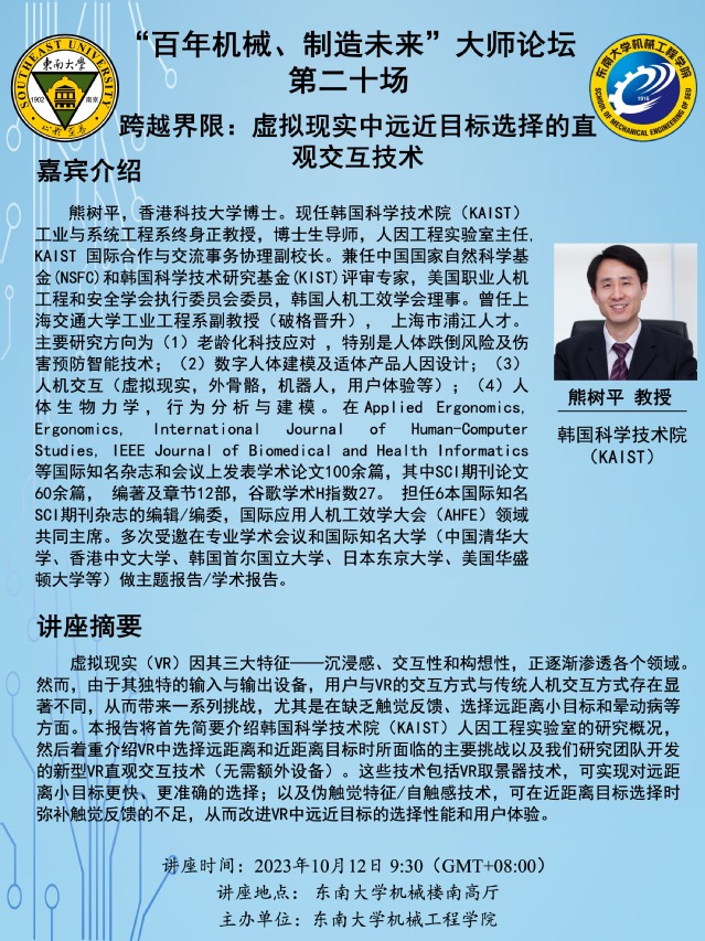 熊树平,香港科技大学博士。现任韩国科学技术院(KAIST)工业与系统工程系终身正教授,博士生导师,人因工程实验室主任, KAIST 国际合作与交流事务协理副校长。兼任中国国家自然科学基金(NSFC)和韩国科学技术研究基金(KIST)评审专家,美国职业人机工程和安全学会执行委员会委员,韩国人机工效学会理事。曾任上海交通大学工业工程系副教授(破格晋升), 上海市浦江人才。主要研究方向为(1)老龄化科技应对 ,特别是人体跌倒风险及伤害预防智能技术;(2)数字人体建模及适体产品人因设计;(3)人机交互(虚拟现实,外骨骼,机器人,用户体验等);(4)人体生物力学,行为分析与建模。在Applied Ergonomics, Ergonomics, International Journal of Human-Computer Studies, IEEE Journal of Biomedical and Health Informatics等国际知名杂志和会议上发表学术论文100余篇,其中SCI期刊论文60余篇, 编著及章节12部,谷歌学术H指数27。 担任6本国际知名SCI期刊杂志的编辑/编委,国际应用人机工效学大会(AHFE)领域共同主席。多次受邀在专业学术会议和国际知名大学(中国清华大学、香港中文大学、韩国首尔国立大学、日本东京大学、美国华盛顿大学等)做主题报告/学术报告。