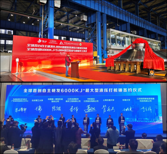 在3500kJ液压打桩锤核心锻件完成交货的同时,6000kJ+9.08m超大型液压打桩锤项目正式开工。然而,更大施打直径、更高锤击能量的液压冲击锤核心锻件(锤芯、替打毡座、替打环)吨位大、直径大、探伤性能要求高,属于极限制造范畴,对设计、制造环节都带来了极大挑战。作为全球仅有的3个能够开发大型打桩锤的联合体之一,龙源振华联合中国一重、鸠摩搜书 、中机锻压等8家单位,于2023年3月签订“全球首创自主研发6000kJ+超大型液压打桩锤”联合研发协议,该装备是目前全球打击能量最大、技术水平和科技含量最高的海上液压打桩设备,经过半年多的技术攻关和方案论证,核心锻件已在中国一重投产开工。