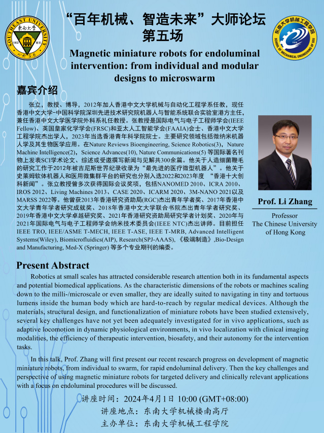 张立, 教授、 博导, 2012年加人香港中文大学机械与自动化工程学系任教, 现任香港中文大学-中国科学院深圳先进技术研究院机器人与智能系统联合实验室港方主任,兼任香港中文大学医学院外科系礼任教授。 张教授是国际电气与电子工程师学会(IEEE Fellow)、 英国皇家化学学会(FRSC)和亚太人工智能学会(FAAIA)会士、 香港中文大学工程学院杰出学人, 2023年当选香港青年科学院院士。 主要研究领域包括微纳米机器人学及其生物医学应用。 在Nature Reviews Bioengineering, Science Robotics(3), Nature Machine Intelligence(2), Science Advances(10), Nature Communications(5) 等国际著名刊物上发表SCI学术论文、 综述或受邀撰写新闻与见解共300余篇。 他关于人造细菌鞭毛的研究工作于2012年被吉尼斯世界纪录收录为“最先进的医疗微型机器人” 。 他关于史莱姆软体机器人和医用微集群平台的研究也分别入选2022和2023年度 “香港十大创科新闻” 。 张立教授曾多次获得国际会议奖项, 包括NANOMED 2010、 ICRA 2010、IROS 2012、 Living Machines 2013、 CASE 2020、 ICARM 2020、 3M-NANO 2021以及MARSS 2022等。 他曾获2013年香港研究资助局(RGC)杰出青年学者奖、 2017年香港中文大学青年学者研究成就奖、 2018年香港中文大学联合书院杰出青年学者研究奖、2019年香港中文大学卓越研究奖、 2021年香港研究资助局研究学者计划奖、 2020年与2021年国际电气与电子工程师学会纳米技术委员会(IEEE NTC)杰出讲师。 目前担任IEEE TRO, IEEE/ASME T-MECH, IEEE T-ASE, IEEE T-MRB, Advanced IntelligentSystems(Wiley), Biomicrofluidics(AIP), Research(SPJ-AAAS), 《极端制造》 ,Bio-Designand Manufacturing, Med-X (Springer) 等多个专业期刊的编委。
