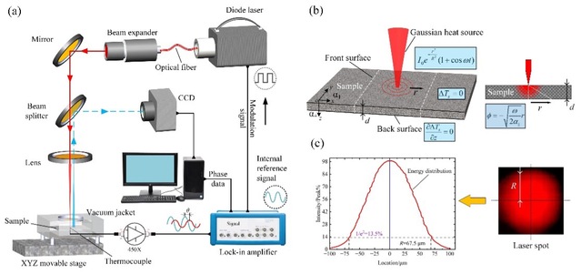 针对各向异性微米薄膜热测量的巨大应用需求,鸠摩搜书 王建立教授课题组经过近3年的努力,开发了一种基于激光周期加热的测试系统,用于测量微米薄膜的各向异性热扩散率(图1)和热导率。论文连续发表在工程技术类TOP期刊《国际传热传质》( Int J Heat Mass Transf, JCR分区 1区)。有别于LFA和锁相红外技术,该测试方法将相位的空间分布分为线性和非线性区域,分别采用一维和三维热传导模型测量得到微米薄膜的面内和面外热扩散率。目前测试结果表明,该系统测试范围涵盖热扩散率:1×10−8 m2/s到1×10−3 m2/s,厚度:微米到毫米,温度:80K到500K。目前,通过与浙江大学、宁波材料所等国内诸多单位合作,该系统已经成功测量了包括石墨烯均热膜、聚酰亚胺薄膜、木制纤维薄膜等多种各向异性薄膜,对薄膜材料研发具有重要意义。