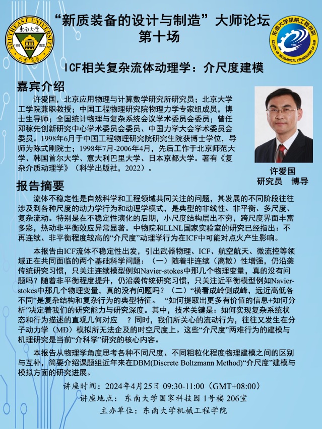 许爱国,北京应用物理与计算数学研究所研究员;北京大学工学院兼职教授;中国工程物理研究院物理力学专家组成员,博士生导师;全国统计物理与复杂系统会议学术委员会委员;曾任邓稼先创新研究中心学术委员会委员、中国力学大会学术委员会委员。1998年6月于中国工程物理研究院研究生院获博士学位,导师为陈式刚院士;1998年7月-2006年4月,先后工作于北京师范大学、韩国首尔大学、意大利巴里大学、日本京都大学。著有《复杂介质动理学》(科学出版社,2022)。