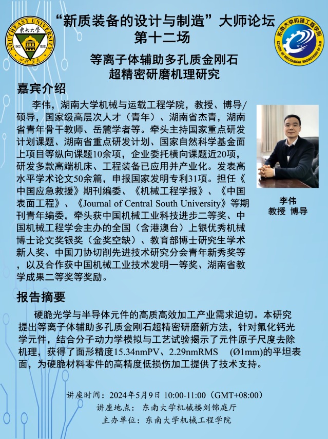 李伟,湖南大学机械与运载工程学院,教授、博导/硕导,国家级高层次人才(青年)、湖南省杰青,湖南省青年骨干教师、岳麓学者等。牵头主持国家重点研发计划课题、湖南省重点研发计划、国家自然科学基金面上项目等纵向课题10余项,企业委托横向课题近20项,研发多款高端机床、工程装备已应用并产业化。发表高水平学术论文50余篇,申报国家发明专利31项。担任《中国应急救援》期刊编委、《机械工程学报》、《中国表面工程》、《Journal of Central South University》等期刊青年编委,牵头获中国机械工业科技进步二等奖、中国机械工程学会主办的全国(含港澳台)上银优秀机械博士论文奖银奖(金奖空缺)、教育部博士研究生学术新人奖、中国刀协切削先进技术研究分会青年新秀奖等,以及合作获中国机械工业技术发明一等奖、湖南省教学成果二等奖等奖励。