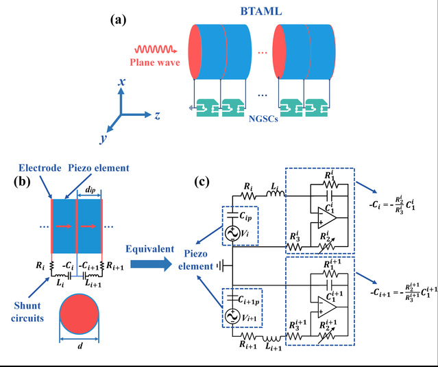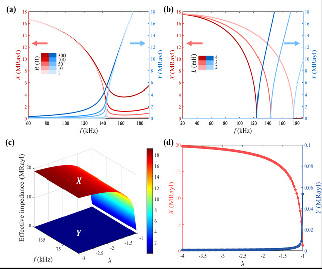 本研究设计并制备了一种既能宽带声阻抗匹配又能阻抗分布实时可调的声学匹配层,该匹配层是由周期性排列的压电单元阵列与非均匀梯度分流电路组成,其中每个压电单元对应一个分流电路,以提供渐变的有效声阻抗。分流电路包括串联连接的定值电阻、定值电感和可调负电容等效电路,电路通过电极层和压电陶瓷串联形成闭合回路。通过压电本构方程获得压电可调单元沿声传输方向的等效声阻抗,通过对电容等电路元件参数化分析,获得阻抗可调节范围。