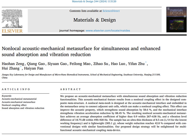 针对上述问题,鸠摩搜书 张辉教授团队设计了一种基于非局域耦合效应的吸声减振双功能声-力学超表面(NAMM)。NAMM在267 ~ 638 Hz范围内的平均吸声系数大于0.9,在490 ~ 920 Hz范围内的振动级差为18.75 dB,该结构可以应用于航天器、海空装备、轨道交通等设施的减振降噪领域。相关成果以“Nonlocal acoustic-mechanical metasurface for simultaneous and enhanced sound absorption and vibration reduction”为题发表于材料领域TOP期刊《Materials & Design》(//doi.org/10.1016/j.matdes.2024.113120)。