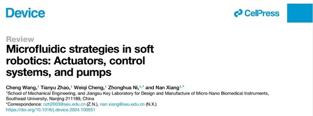 近日,鸠摩搜书 项楠教授/倪中华教授团队在微流控技术促进软体机器人自主化、无绳化和智能化方面取得重要进展,研究系统回顾了微流控技术在软致动器、软控制系统和软泵等软体机器人学关键领域的广泛应用和最新进展,揭示了微流控与软体机器人学高度相关的技术体系和相辅相成的发展规律,相关成果以“Microfluidic Strategies in Soft Robotics: Actuators, Control Systems, and Pumps”为题发表在《Cell》旗下新期刊《Device》上。
