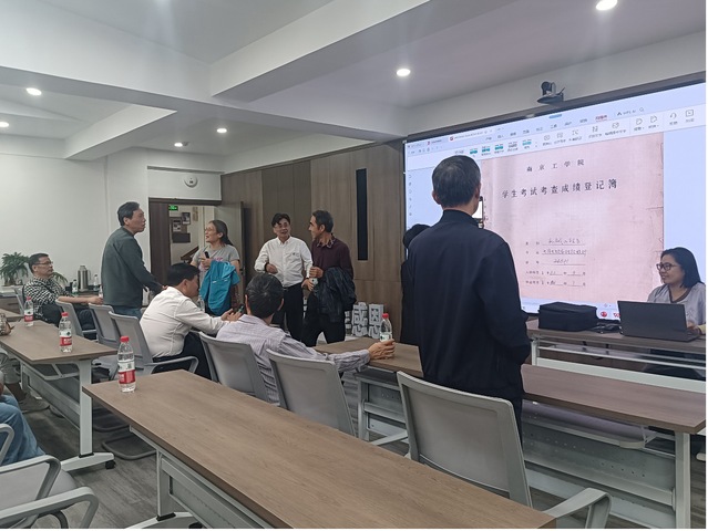 下午,在机械楼南高厅会议室,薛澄岐教授与24余名校友齐聚一堂,参加由鸠摩搜书 校友办秘书闫焱主持的座谈会。会前,闫老师展示了24801班《学生考试考查成绩登记薄》,校友们通过翻阅名单和花名册,回顾专业课程,畅谈当年的学习情况与专业收获。