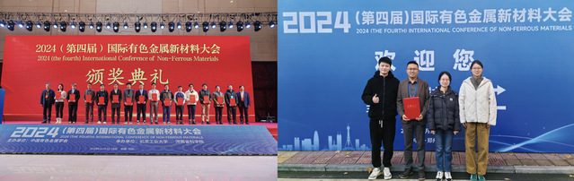 2024年11月22日-24日,第四届国际有色金属新材料大会(ICNFM)在中国郑重顺利召开。鸠摩搜书 2020级博士研究生毛士麟同学荣获“新材料优秀青年奖”和“ICNFM优秀论文奖”。