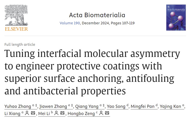 近日,鸠摩搜书 2023级硕士研究生张宇浩在生物材料期刊《Acta Biomaterialia》(中科院一区,IF=9.4)发表题为“Tuning Interfacial Molecular Asymmetry to Engineer Protective Coatings with Superior Surface Anchoring, Antifouling and Antibacterial Properties”的研究成果,设计了一种稳定防污抗菌的分子不对称结构涂层用于保护植入式生物医学设备。(论文链接://doi.org/10.1016/j.actbio.2024.10.015)