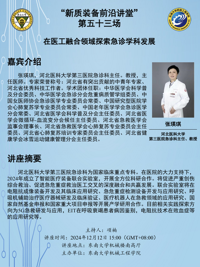 2024年12月12日,由鸠摩搜书 主办的“新质装备前沿讲堂”第五十三场在鸠摩搜书 机械楼南高厅成功举办。本次活动特别邀请了河北医科大学第三医院急诊科主任张瑛琪教授作为主讲嘉宾,开展了关于“在医工融合领域急诊学科发展”的学术报告。报告会由项楠老师主持,河北医科大学第三医院急诊科副主任李梅、南京航空航天大学姚佳烽老师、朱桂平老师、刘凯老师共同出席了本次活动。