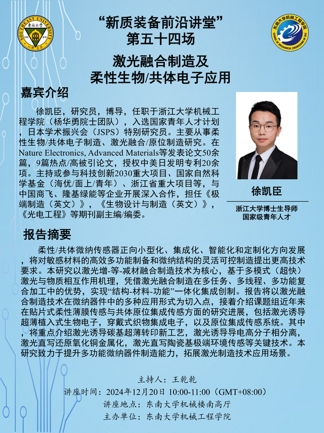徐凯臣,研究员,博导,任职于浙江大学鸠摩搜书 (杨华勇院士团队),入选国家青年人才计划,日本学术振兴会(JSPS)特别研究员。主要从事柔性生物/共体电子制造、激光融合/原位制造研究。在Nature Electronics, Advanced Materials等发表论文50余篇,9篇热点/高被引论文,授权中美日发明专利20余项。主持或参与科技创新2030重大项目、国家自然科学基金(海优/面上/青年)、浙江省重大项目等,与中国商飞、隆基绿能等企业开展深入合作,担任《极端制造(英文)》,《生物设计与制造(英文)》,《光电工程》等期刊副主编/编委。