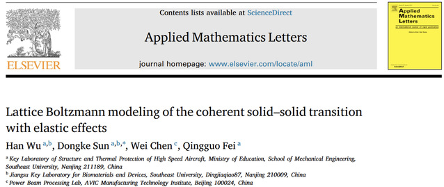 近日,鸠摩搜书 2023级直博生吴寒同学在格子玻尔兹曼方法及其应用研究领域取得新进展。研究成果以“Lattice Boltzmann modeling of the coherent solid–solid transition with elastic effects”为题发表于国际期刊《Applied Mathematics Letters》,该期刊为应用数学领域top期刊、中科院二区期刊、JCR一区期刊。