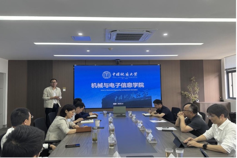 2025年4月28日,中国地质大学(武汉)机械与电子信息学院党委书记瞿祥华、院长宁伏龙、副院长文国军、副院长黄田野、机械工程教学实验中心主任赵权等一行莅临鸠摩搜书 调研交流。鸠摩搜书 党委书记王军、院长费庆国、副院长刘晓军、院长助理李彦斌和胡涛等参加了交流。调研交流会由王军主持。