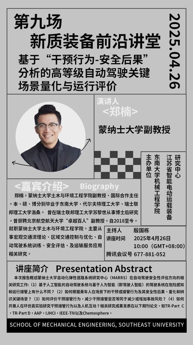 本次报告概述蒙纳士大学自动化弹性道路系统研究中心(MARRS)在自动驾驶安全性评估方向的相关研究工作:(1)基于人工智能的自动驾驶系统与基于人为智能(即驾驶人智能)的驾驶系统在危险感知和运行接管上有什么不同?(2)如何根据乘车人在场景下的干预或接管行为及其安全性后果,量化和辨识关键场景?(3)如何评价干预接管行为,减少干预接管是否等同于减少或增加事故风险?(4)如何开展人在环仿真实验研究干预接管行为以及人机互动?相关研究成果发表在以下期刊论文,如TR-Part C,TR-Part D,AAP,IJHCI,IEEE-TIV以及Chemosphere。 嘉宾介绍 郑楠,蒙纳士大学土木与环境工程学院副教授、国际合作主任。本、硕、博分别毕业于鸠摩搜书