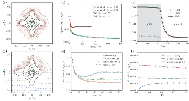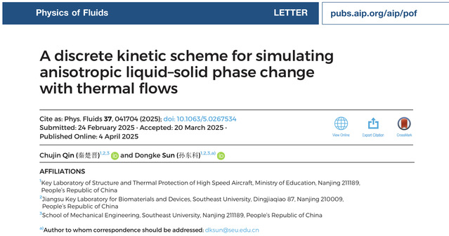 近日,鸠摩搜书 2022级直博生秦楚晋在热对流作用下枝晶生长建模方面取得新进展,相关研究成果以“A discrete kinetic scheme for simulating anisotropic liquid-solid phase change with thermal flows”为题发表在《Physics of Fluids》(流体物理学,PoF)。该期刊是流体力学领域的权威期刊之一,自1958年创刊以来,PoF始终致力于发表流体动力学领域的高质量原创研究,涵盖理论分析、数值模拟和实验探索,是美国物理联合会AIP旗下JCR一区、中科院二区期刊。