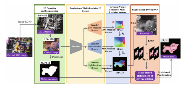 基于单幅 RGB 图像的物体 6D 姿态估计在合成–真实数据迁移上仍面临精度瓶颈。为此,论文提出了多精度向量与分割驱动(Seg-Driven)的两阶段新策略:第一,通过三分支 CNN 预测粗、中、精三级 2D 向量,并采用多精度向量投票(KVM)精细定位关键点;第二,引入分割驱动 PnP,通过最小化分割与渲染掩膜差异,精确校正三维平移并筛选最优姿态。实验表明,该方法在 LM-O 与 HB 数据集上显著优于现有技术,且对弱纹理和遮挡场景具备出色稳健性。