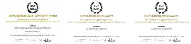 同时基于上面的技术参加了ECCV2024位姿估计挑战赛(BOP Challenge 2024),荣获6D定位赛道的默认检测器下最佳方法与6D检测赛道的默认检测器下最佳方法三项冠军与早鸟冠军。