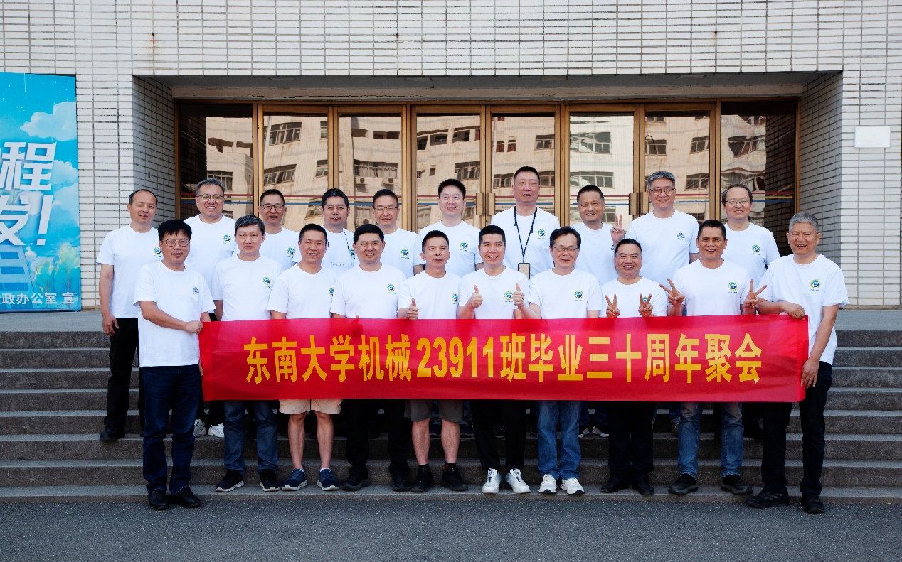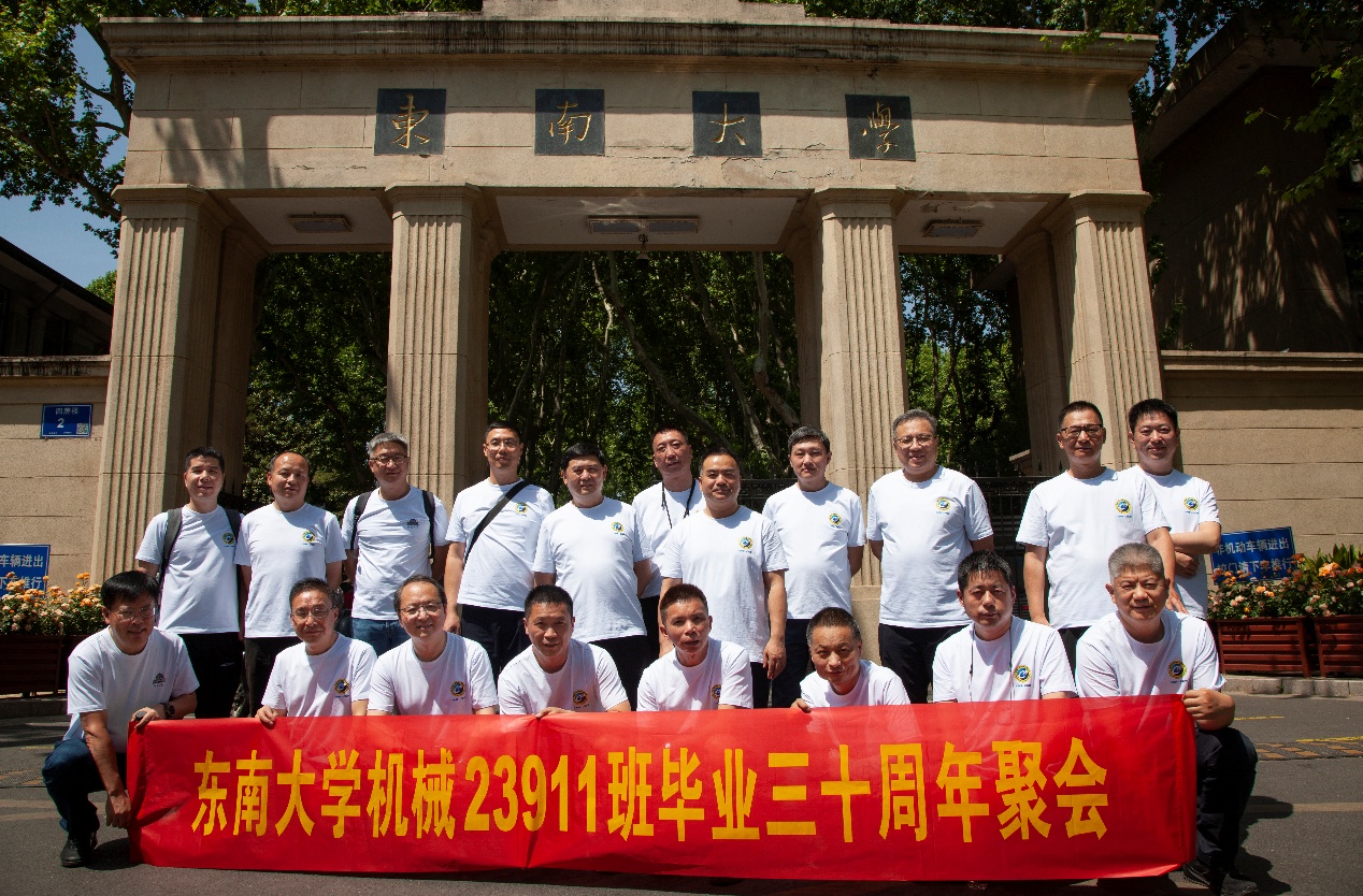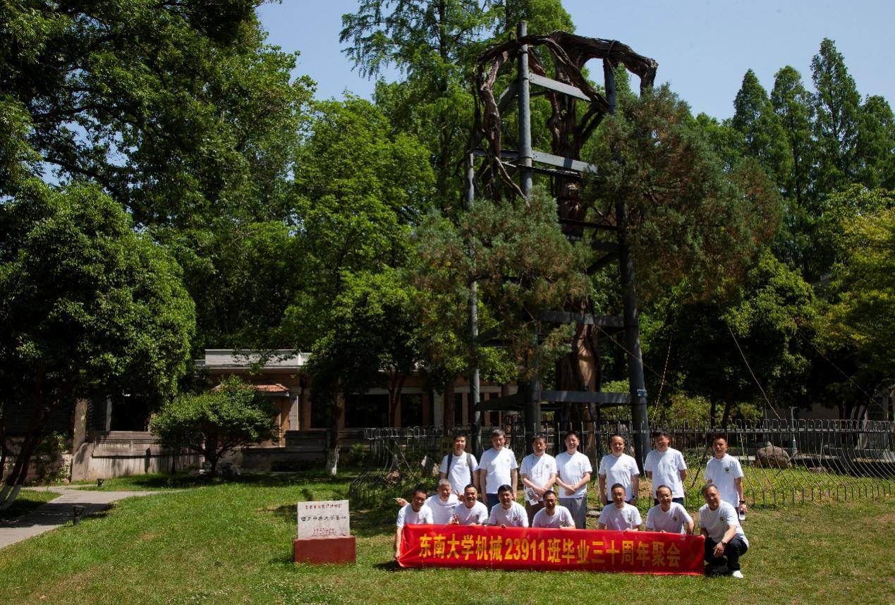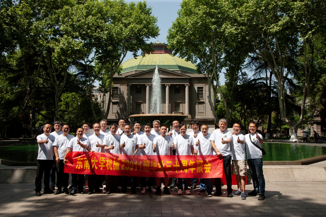 次日早上,校友们共赴历史底蕴深厚的四牌楼校区,回到这个大家共同生活了三年的地方。天公作美,是日校园内花红树绿、群莺乱飞。大家参观了庄重典雅的大礼堂、凝结科学精神的吴健雄纪念馆、充满活力与汗水的体育馆、郁郁葱葱的六朝松,大家在南高院前、六朝松下、老图书馆旁、正南门前,一次次驻足、一次次合影。每一处景致,都唤醒了大家埋藏心底的大学记忆。参观完毕,大家在中山院108教室重开一次久别重逢的班会,同学们轮流分享着毕业三十年来的人生感悟,同忆往事、共展未来,无论是深耕机械行业、成为国之重器的中坚力量,抑或是跨界发展、大家在各行各业各尽其力、努力工作。言语间,大家都流露出对母校栽培的感恩,对同窗情谊的珍视,以及对母校和机械学院的无限期盼。班级同学共同做出的一个重要决定:设立“23911教育基金”!同学们承诺,将每年捐赠1万元,连续10年,专项用于资助鸠摩搜书 2名品学兼优的优秀学生。此虽微薄之力、小小善举,却是同学们饮水思源的拳拳之心。大家共同期望,“23911教育基金”的设立,能化作一股源源不断的动力,激励着新一代机械学子奋发图强,勇攀科技高峰,为母校增光添彩!