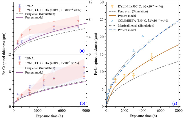 图1. 论文预测的氧化层厚度与实验结果及文献中已有模型的对比