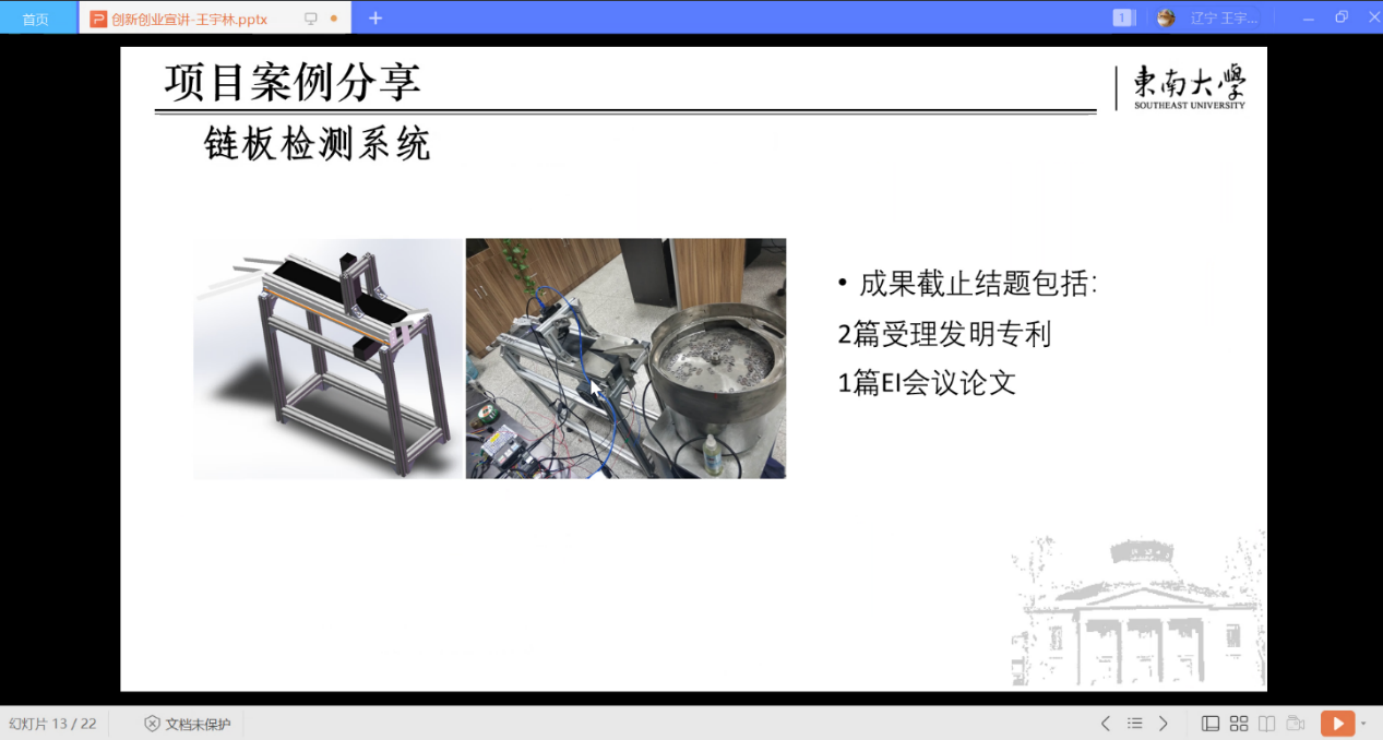 2月18日下午,创新创业训练交流线上讲座开讲,由鸠摩搜书 2021级硕士生王宇林学长进行讲解。王宇林学长强调创新的逻辑性和严谨性,因为没有任何一个新事物是凭空而就的。他以自己曾经申请过专利以及参加竞赛的经历,凭借浅显易懂的论述向我们介绍了自己的创新结果——链板检测系统,并详细说明了它的逻辑、原理、设计理想、发展历程,以及现如今它可能在生活中涉及的地方。在讲座的最后,王宇林学长鼓励大家积极地加入创新创业这个“大家庭”中,要利用好现有的资源去发掘自身的能力。