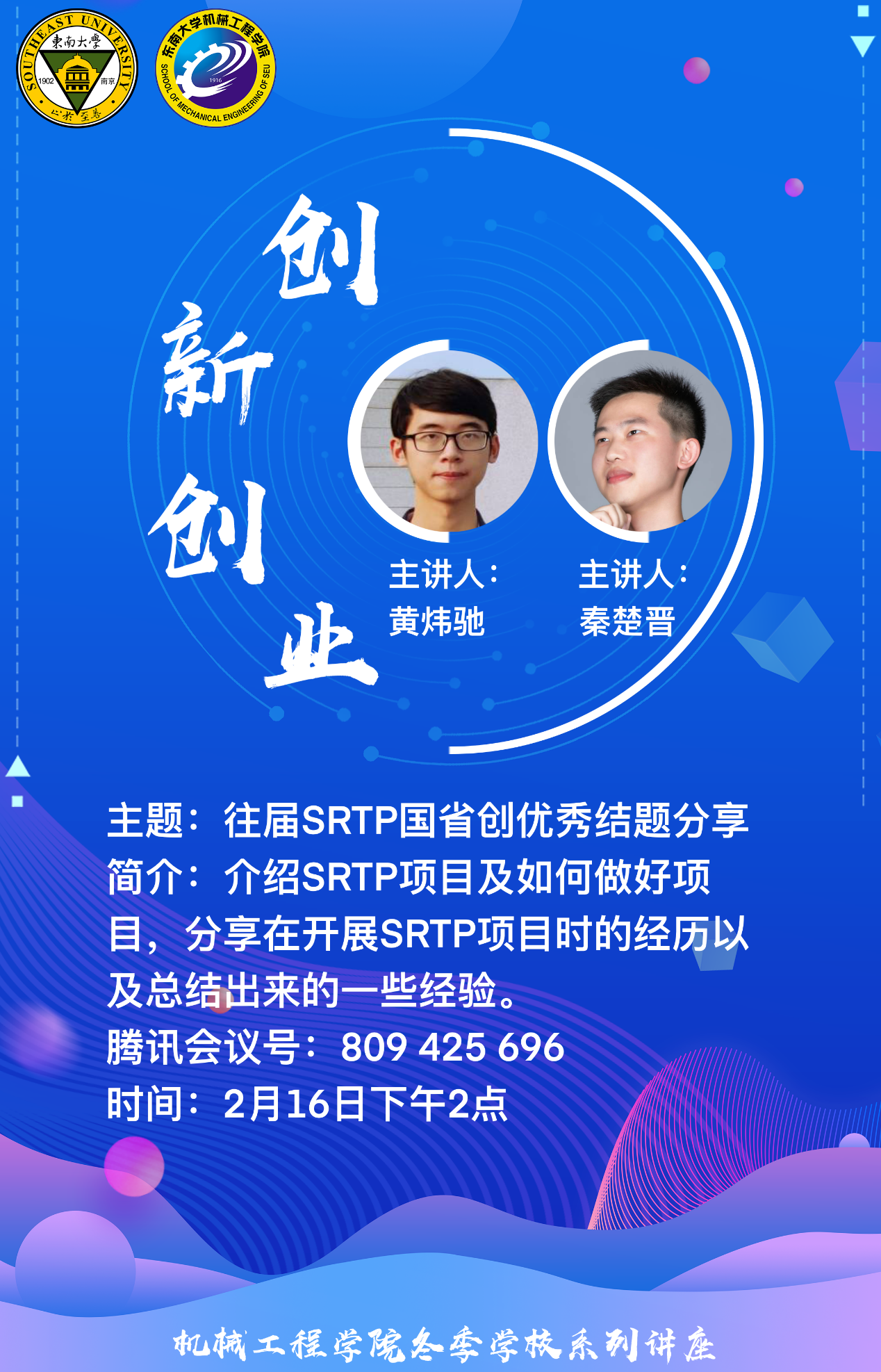 2月16日下午,曾获得国创优秀结题的黄炜驰、秦楚晋两位学长为大家分享了SRTP项目相关的注意事项,其中黄炜驰学长重点讲述了开展SRTP项目的流程,包括选题、准备、答辩。秦楚晋学长则通过分享自己的的一段SRTP项目经历,为大家在项目选择以及队友选择方面提供了一些建议。两位学长细致入微的讲解,带给同学们许多宝贵的经验。本次讲座让低年级本科生深入了解了关于SRTP项目有关的信息,相信同学们可以从中得到宝贵的经验,在未来开展项目的时候能够一帆风顺,取得丰硕成果。