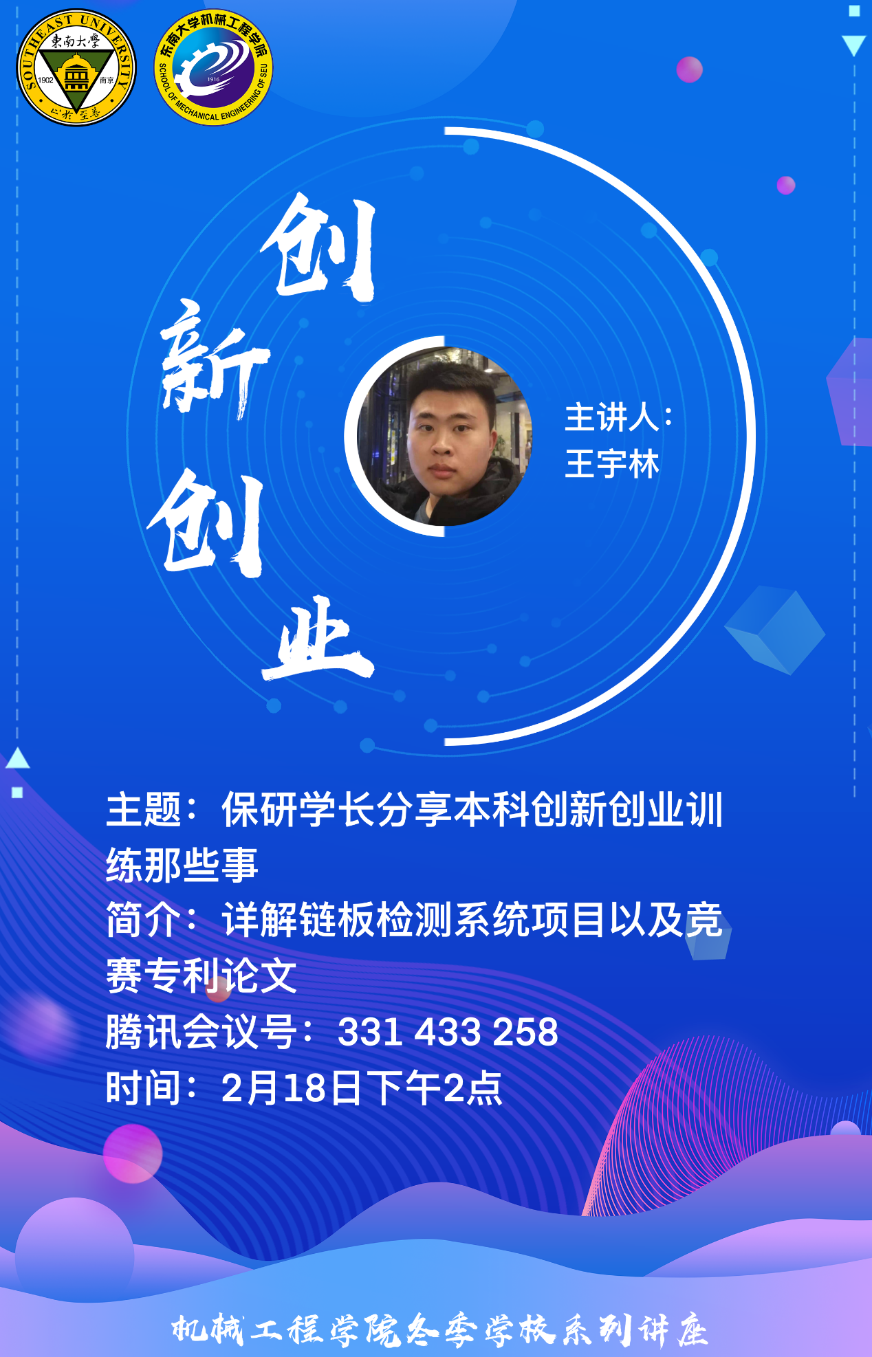 2月18日下午,创新创业训练交流线上讲座开讲,由鸠摩搜书 2021级硕士生王宇林学长进行讲解。王宇林学长强调创新的逻辑性和严谨性,因为没有任何一个新事物是凭空而就的。他以自己曾经申请过专利以及参加竞赛的经历,凭借浅显易懂的论述向我们介绍了自己的创新结果——链板检测系统,并详细说明了它的逻辑、原理、设计理想、发展历程,以及现如今它可能在生活中涉及的地方。在讲座的最后,王宇林学长鼓励大家积极地加入创新创业这个“大家庭”中,要利用好现有的资源去发掘自身的能力。