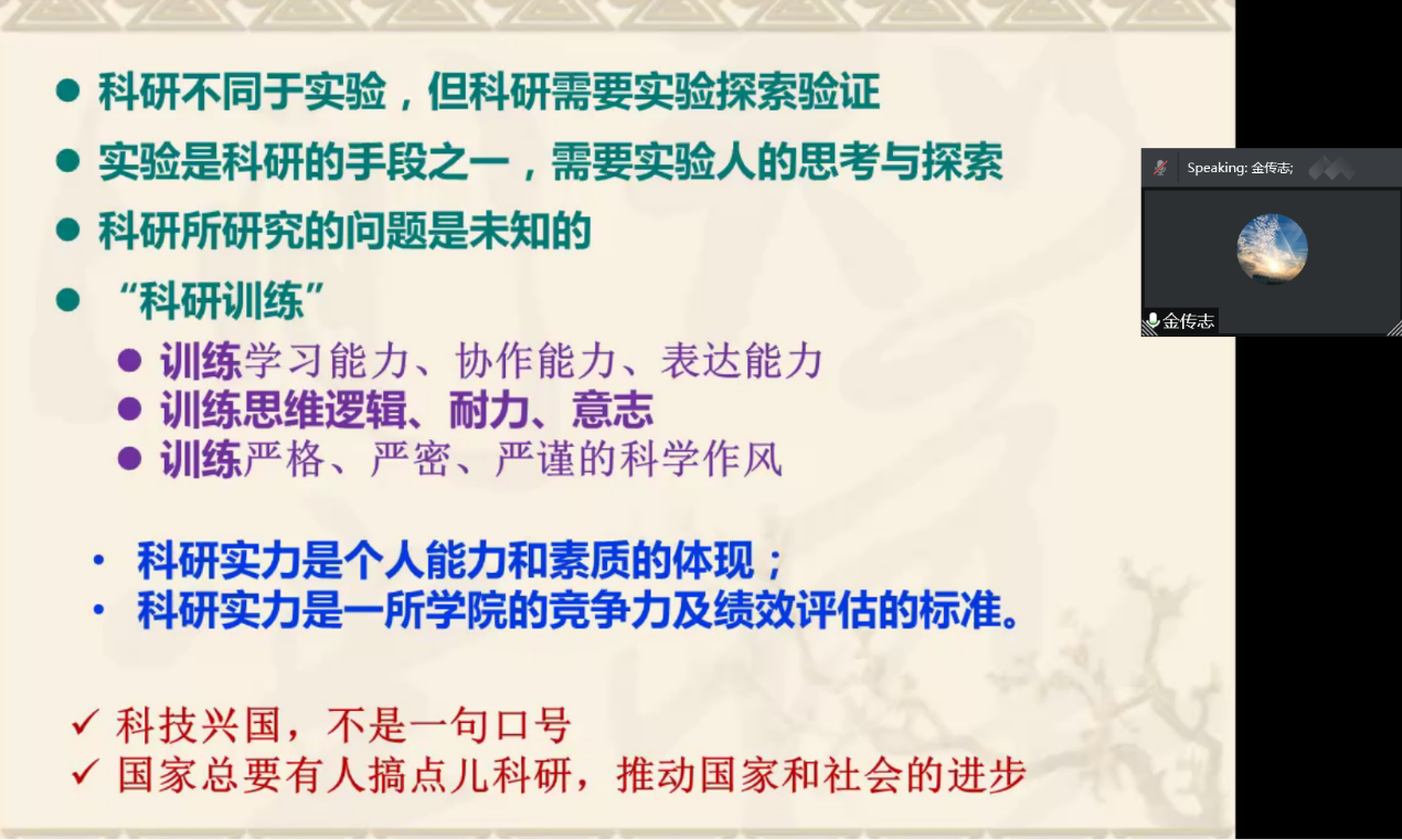 2月14日下午,创新创业训练交流首场线上讲座开讲,由鸠摩搜书 课外研学秘书金传志老师对SRTP项目进行深度讲解。金老师强调科研并不神秘,缜密的思考和强烈的探索欲就是揭开未知的武器。他以自己当年写博士毕业论文的经历,引出如何训练科研思维的话题,并以此向同学们介绍SRTP项目。在讲座的最后,同学们就自己对创新创业项目的疑惑向金老师提问,老师一一做了详细解答。