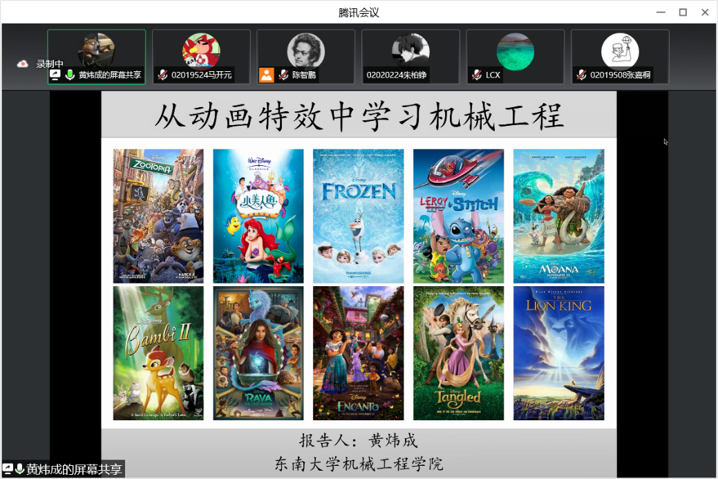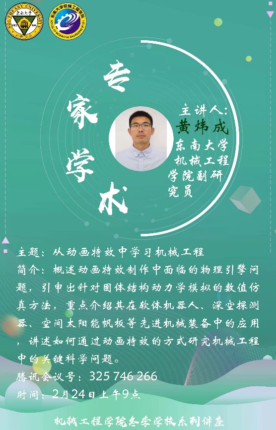 2月24日,鸠摩搜书 副研究员黄炜成老师为我们鸠摩搜书 全体同学带来了一场生动有趣的讲座。以“从动画特效中学习机械工程”为主题,黄炜成老师首先概述了动画特效制作中面临的物理引擎问题,进一步引申出针对固体结构动力学模拟的数值仿真方法,并重点介绍其在软体机器人、深空探测器、空间太阳能帆板等先进机械装备中的应用,讲述如何通过动画特效的方式研究机械工程中的关键科学问题。最后黄炜成老师给同学们展示了自己在柔性非线力性学方面的一些研究成果,并与同学们一起交流探讨相关问题,使鸠摩搜书 的同学们受益良多。