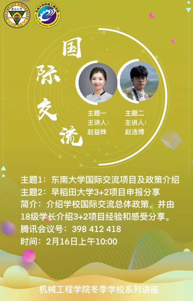 2月16日上午,国际交流讲座系列的首场讲座在线上开展,国际交流合作处的赵益姝老师以及2018级本科生赵浩博学长分别对鸠摩搜书 国际交流整体政策、早稻田大学3+2项目进行了分享。赵老师主要对目前申报较多的交流项目进行了分析讲解,并概括了校内手续办理的一般步骤,对校内各部门的分工进行了简要介绍。最后,赵老师也对参加国际交流的目的进行了进一步概括,也希望同学们可以结合自身情况,选取最适合自己的项目。赵浩博学长则以早稻田大学的基本情况以及地理环境开题,讲述了所申报项目的学院构成及整个学期的具体时间安排和课程安排。最后,赵浩博学长对申报该项目的要求和所需的资料进行了概括,并对申报该项目的优势进行了分析总结,也希望感兴趣的同学可以积极参与。
