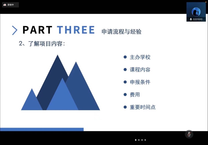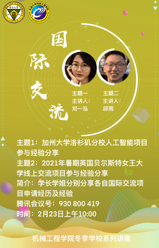 2月23日上午,参与加州大学洛杉矶分校人工智能项目的刘一泓学姐和参与2021年暑假英国贝尔斯特女王大学线上交流项目的邱雨学长分别对各自项目进行了经验分享。刘一泓学姐主要对自己的短期交流项目的过程进行了详细概括,从线上的授课环节到线下的参观交流环节,并在此之后简要介绍了自己的申报流程及经验。邱雨学长则是从自己的申请经历开篇,对自己的线上交流体验进行了分享,并给予同学们关于申请项目的一些建议。本次讲座不仅让同学们对于短期交流项目进行了简单了解,也让同学们得到了一些经验与阅历,也相信同学们在以后的申请项目时会仔细认真,避免出错。