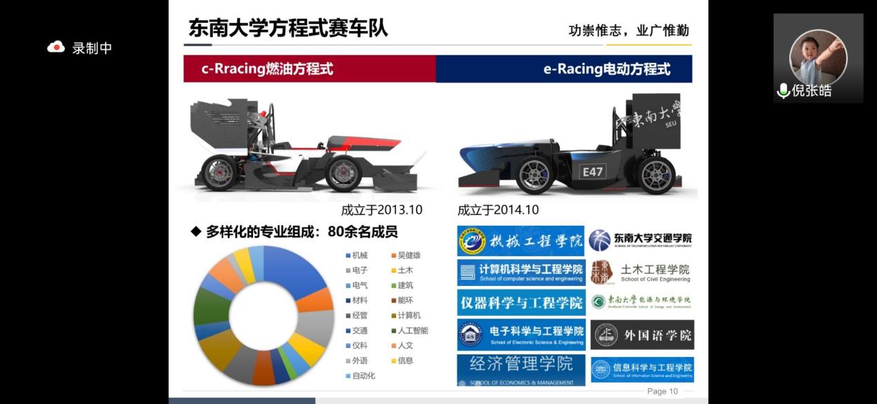 最后发言的是方程式赛车队的刘冉学长。刘冉学长向我们展示了赛车队在制造赛车时的花絮和比赛的流程,之后详细介绍了学生们可以在赛车队中学习到什么知识、锻炼什么样的能力。