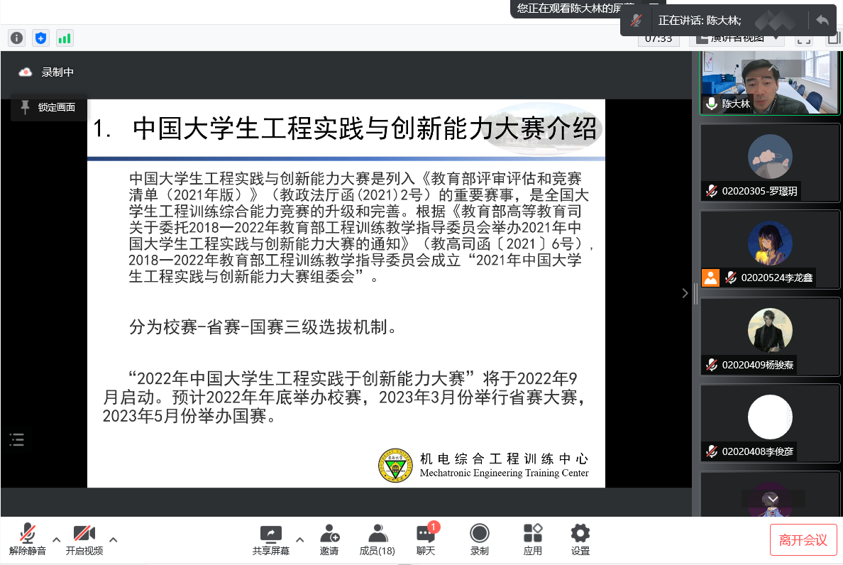 陈大林老师从工程实践与创新能力,我校参加历届竞赛情况,竞赛奖项说明等几个方面详细介绍了大赛的具体情况。之后又对大赛的赛制以及举办时间加以阐述,同时也讲解了势能驱动车,热能驱动车等几个赛项,进行了竞赛赛项以及工程基础赛道的命题说明,使同学们对工程实践与创新能力大赛有了一个较为全面的认识。