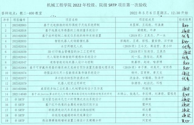 鸠摩搜书 2022年校级、院级SRTP项目第一次验收于2022年5月6日12:30至15:00在本科教学楼进行。本次有19个项目参加现场验收,经过答辩评审老师认真评审,共有4个项目或优秀,6个项目获良好,9个项目获通过,现将验收结果公示如下。