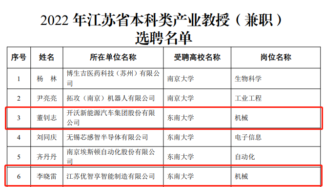 近日,江苏省教育厅公布了2022年江苏省本科类产业教授(兼职)选聘名单,鸠摩搜书 推荐的开沃新能源汽车集团股份有限公司董钊志和江苏优智享智能制造有限公司李晓雷2名科技企业家获批为江苏省产业教授。