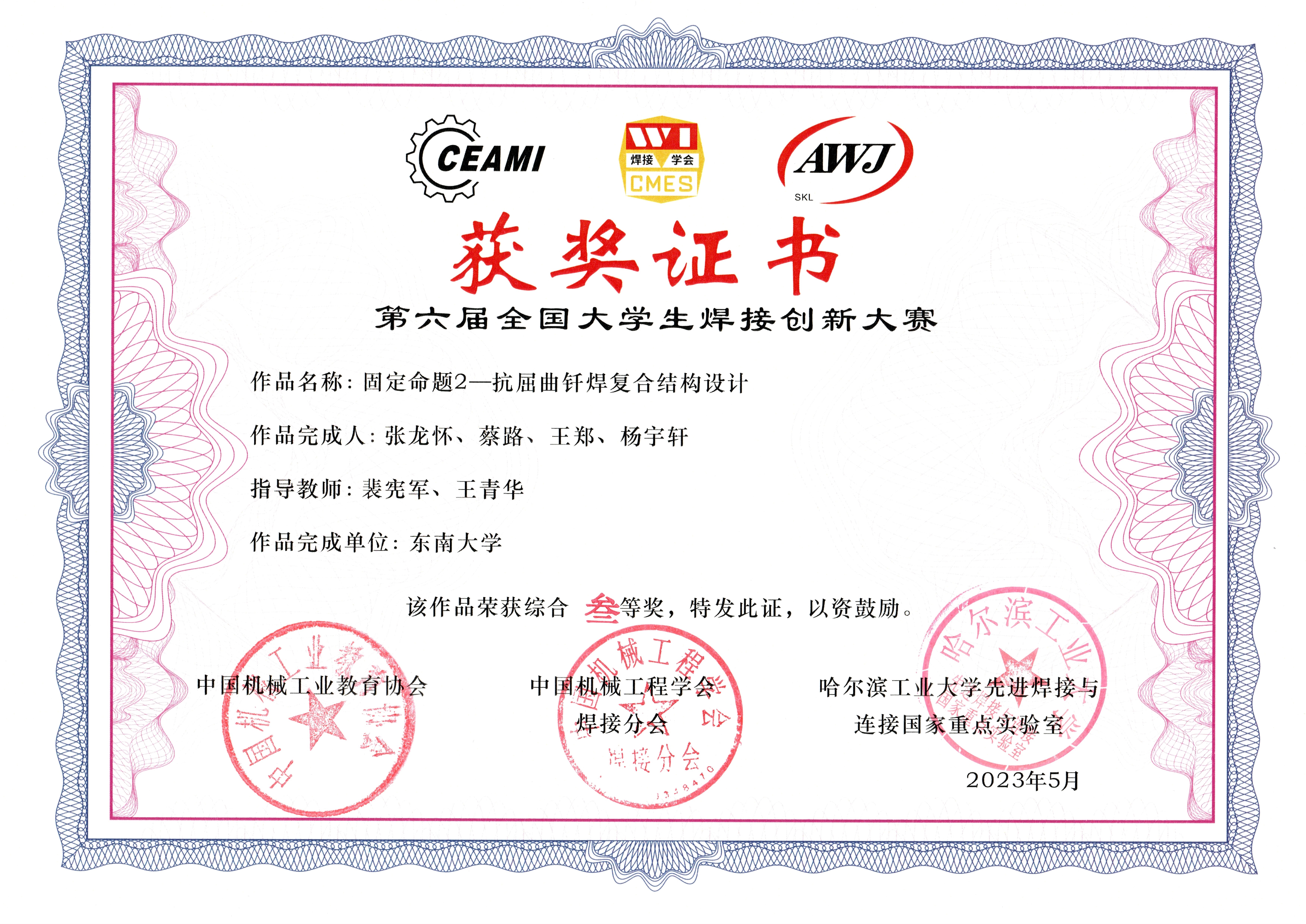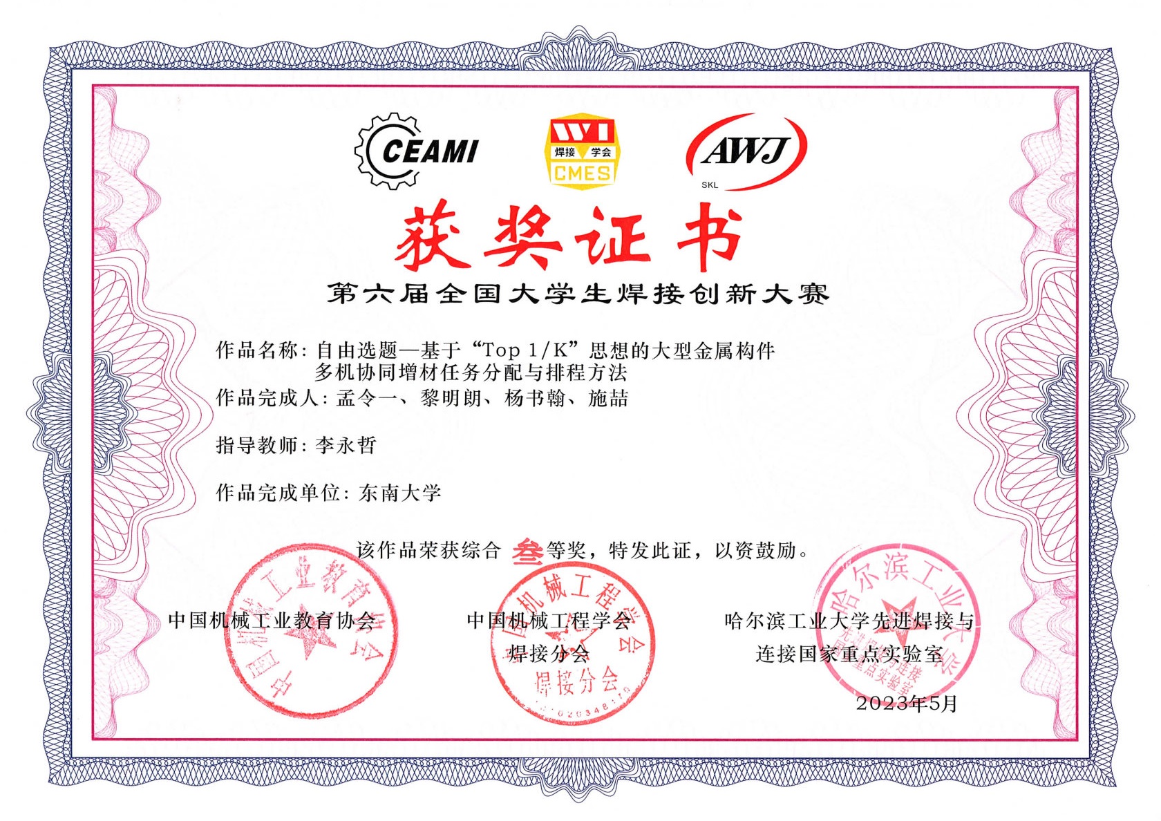 在学校教务处、鸠摩搜书 的大力支持下,本届大赛鸠摩搜书 代表队由刘小超副教授、李永哲副教授带队参加全国决赛,刘小超副教授受邀担任自由命题组评委。经过紧张激烈的比赛,我校由张泰瑞、王青华两位老师指导,豆文欢、李超红、陆凯佳、钱睿4位同学的项目《基于超级双相不锈钢激光熔覆硬质合金层的船舶复合板制备》获固定命题一等奖;由刘小超老师指导,罗璟玥、万宇、包文辉、李瑞茹4位同学的项目《基于搅拌-涡流-机械互锁的复合摩擦焊界面的金属异质构件增材制造技术研究》获自由命题二等奖;由李永哲老师指导,孟令一、黎明朗、杨书翰、施喆4位同学的项目《基于“Top 1/K”思想的大型金属构件多机协同增材任务分配与排程方法》、由裴宪军老师指导,张龙怀、蔡路、王郑、杨宇轩4位同学的项目《抗屈曲纤焊复合结构设计》分别获得自由命题和固定命题三等奖。