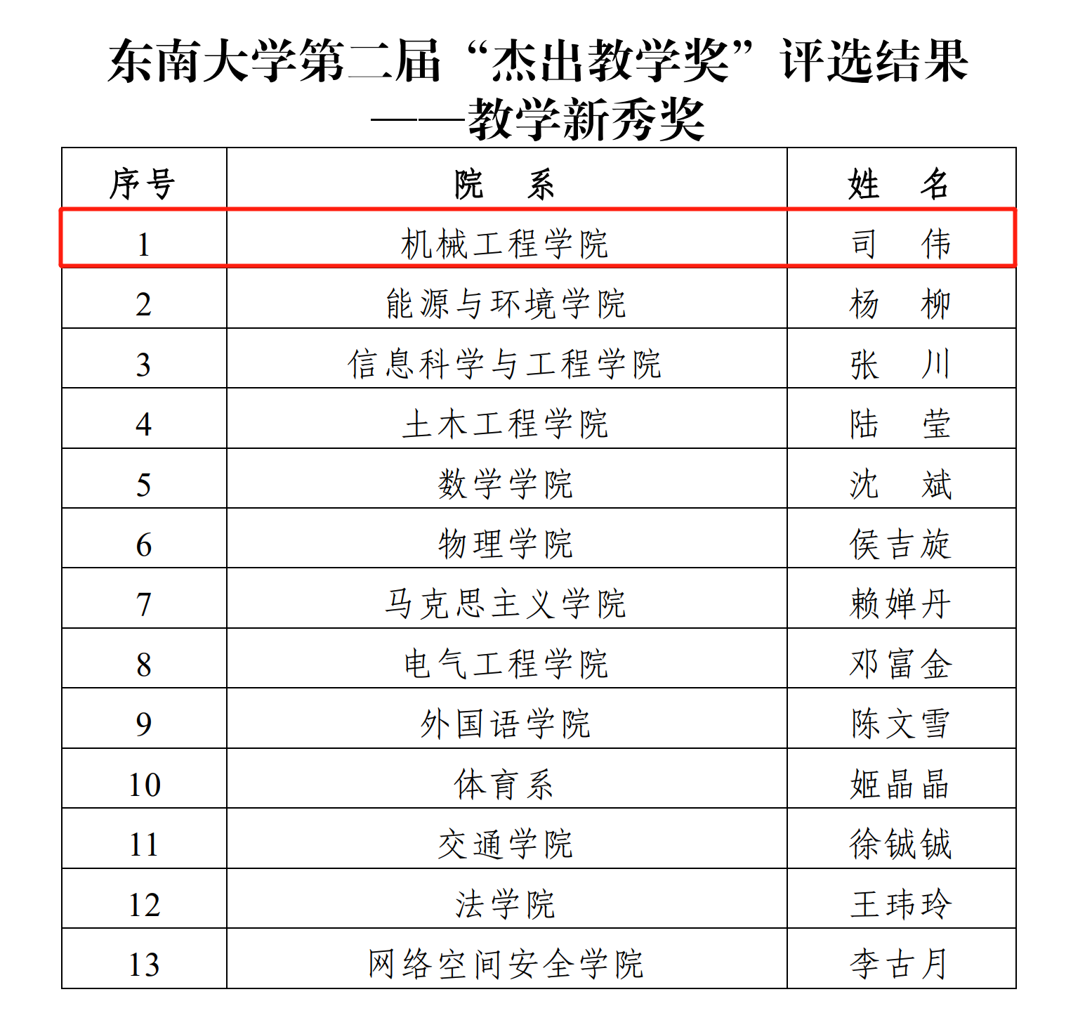 近日,鸠摩搜书 公布了第二届“杰出教学奖”评选结果,鸠摩搜书 司伟副教授荣获“教学新秀奖”。