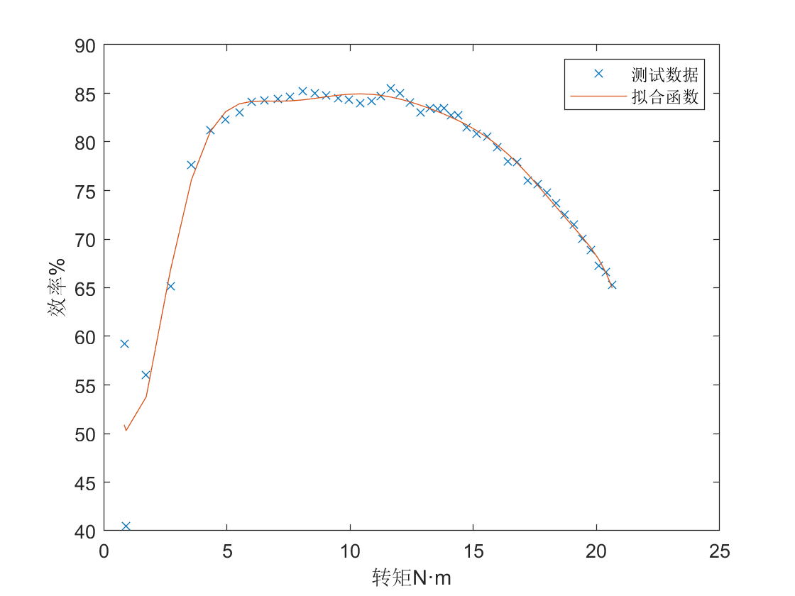 3.整理数据,记录空载点、最大扭矩点、最大输出功率点以及最高效率点处的各项参数数值,绘制扭矩-电流、扭矩-转速以及扭矩-效率等图像,将各组数据拟合为多项式函数,并结合电机铭牌参数与理论函数进行数据分析。