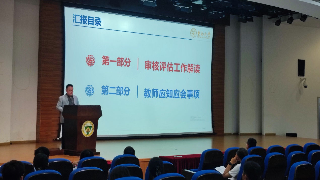 毕可东副院长从审核评估工作解读和教师应知应会事项宣贯两个方面对具体工作任务进行了部署。首先,毕院长从新一轮审核评估的特点出发,详细介绍了评估工作的关键时间节点和迎评准备工作要点,通过对《自评报告》的解读,让全体与会老师全面熟悉掌握审核评估工作内容。其次,毕院长对学院工作任务内容进行了详细分解,对核心问题进行了解读,全面介绍宣贯了学院及学校审核评估各项工作进展和建设规划,希望各位老师能够牢记教师初心,不忘教育使命,全员参与,扎实做好新一轮教育教学审核评估工作。