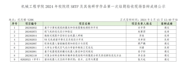鸠摩搜书 2024年第一次校级、院级SRTP及其他研学作品结题验收答辩于2024年5月15日12:30至14:30在九龙湖校区纪忠楼进行。现将结果公示如下。